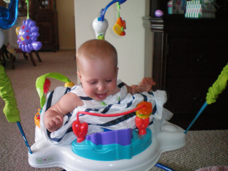 Time seems to be flying by these days! It really feels like Kloey is growing and changing each and every day! Kloey has mastered the roll and steam rolls around rooms to get to different items that she wants. It’s funny because if a desired toy is just out of reach, rather than try and thrust herself one centimeter forward, she will roll onto her back and completely forget what she wanted in the change of scenery — from the carpet to the ceiling! Like Kayden, there doesn’t seem to be ANYTHING that this child is so motivated to have that she’ll pull a leg under her and crawl for it! If she can’t reach it, OH WELL!! Unlike Kayden, however, Kloey moves! She no longer gets upset by rolling off the carpet onto the wood floors. She does, however, get upset when she finds herself under a table or partially stuck under the couch. ๐ Kloey is babbling more and more these days. I’m pretty sure she thinks it’s funny to say Da-Da all day, because I always say ‘No Da-Da, Say MA-MA!!” She always giggles when I say this! Kloey still loves her bouncer and Mommy loves that because it allows me some freedom to get things done! Kloey loves to clap, play patti-cake, and is super ticklish! She is a great sleeper and takes great naps during the day! She is learning to roll with the punches as her sister tries to hold her hand, hug her until she falls over, or play tug-of-war with her (Kloey’s got a great grip!). And finally, I am proud to say that Kloey is FINALLY getting some teeth! We were pretty sure she was teething back in November! The fun part about this is that she is getting her two UPPER teeth first. No bottom teeth yet! I think this means she’ll be getting all four (two upper, two lower) teeth all at the same time! ๐ So far she is taking it like a champ and we haven’t had any hiccups to sleeping! Kayden never seemed bothered by getting teeth, so my fingers are crossed that Kloey is just as tough! Yes, I just described Kayden as tough! Ha!!